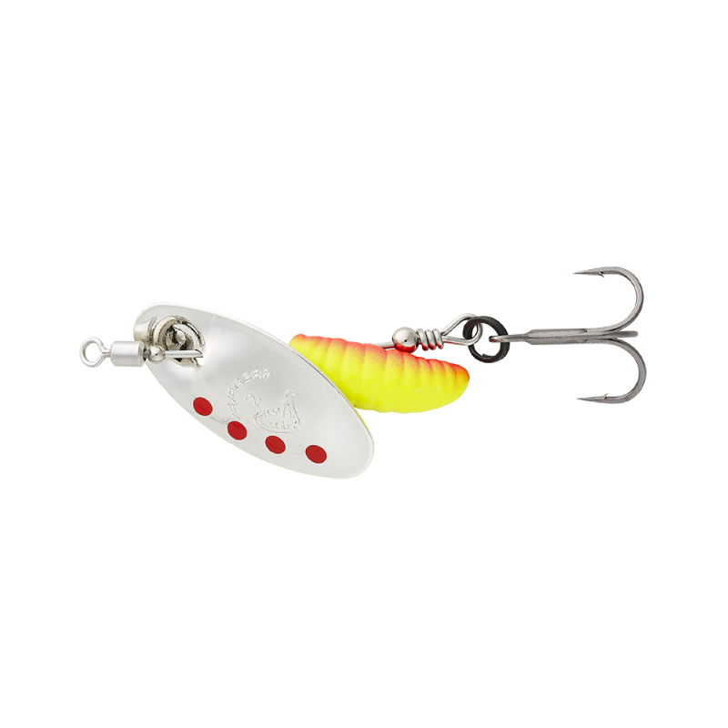 Het madenvormige lichaam in combinatie met de unieke actie betekent dat deze spinner zeker roofdieren zal verleiden om aan te vallen. De roterende, flitsende vleugel, die de aandacht van vissen trekt, combineert met een subtiel en aantrekkelijk ogend lichaam. De ingebouwde wartel helpt het draaien van de lijn te voorkomen en het aantal succesvolle haken wordt vergroot door de aanwezigheid van zeer scherpe dreggen en even scherpe enkele haken.