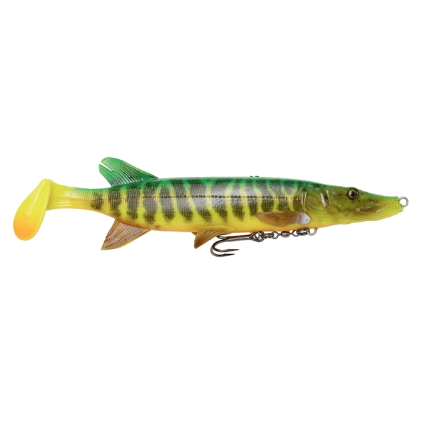 De Savage Gear 4D Pike Shad is gebaseerd op een 3D-scan van een echte baby snoek met perfecte details, Photo Chrome skin print en toegevoegde DNA-geur! Jonge snoeken maken deel uit van de voedselkringloop voor grote snoek en dit super realistische kunstaas is een perfecte imitatie! De op de buik gemonteerde dreg is bevestigd aan een wartel, waardoor het voor een snoek moeilijker is om de haak los te schudden tijdens een gevecht. De peddelstaart laat het lokaas verleidelijk schommelen en de rammelaar in de staart verspreidt lokkende vibraties. Hét kunstaas voor grote kannibalistische snoeken!