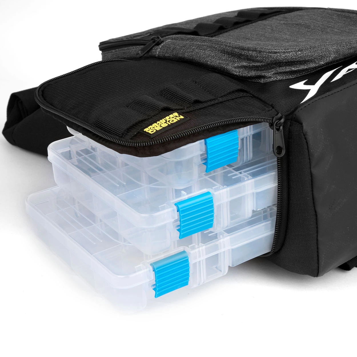 De Yasei Rucksack beschikt over een ruim, waterdicht, hoofdvak voorzien van ‘roll top’, een snel en eenvoudig te bereiken tacklebox vak onderin en een voorvak voor accessoires of kunstaas. Met Organised Compact Design (OCD) connecties aan de voor- en zijkant voor het bevestigen van diverse Yasei cases. Tool pocket op snel toegankelijke positie. De rugtas wordt geleverd inclusief 3 medium formaat kunstaas opbergboxen die perfect passen in het onderste opbergvak. Met HD Zippers en Power Stitching voor extra lange levensduur.